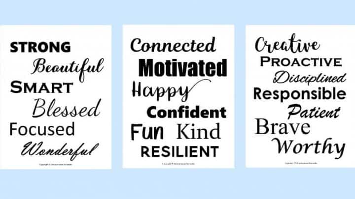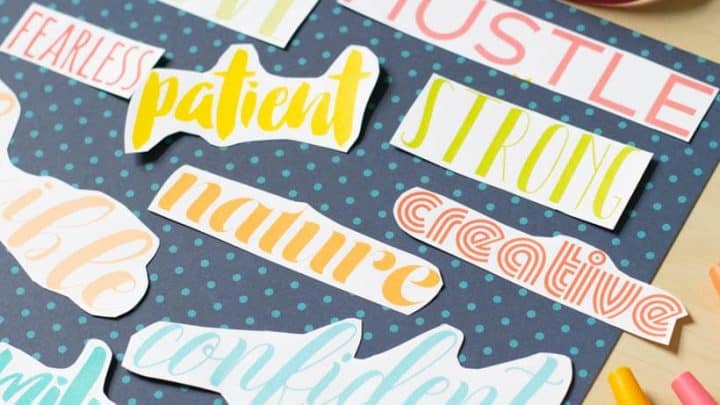 This blogger created free printable vision board words that you can download for free! The printable sheet is full of inspirational words like "laughter", "explore", "strength", "adventure" "believe" and many more. The words are typed with fun fonts and are easy to cut out and attach to your dream board.