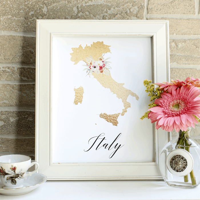 Got wanderlust? These 8x10 prints will depict your traveling goals in FABULOUS fashion. There is a large selection of countries, all beautifully illustrated in faux gold leaf and embellished with a brightly colored bouquet of flowers. Just pick the country (or countries) on your bucket list and add them to your vision board.