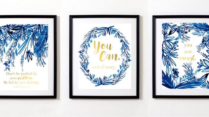 These printable quotes are absolutely gorgeous. It's a set of three art prints which include "You can. End of story", "You are enough" and "Don't be pushed by your problems. Be led by your dreams". Each print has its own rich indigo and gold design, but all match each other.